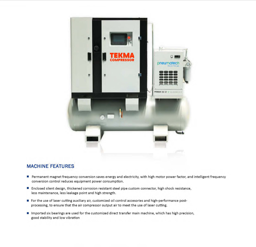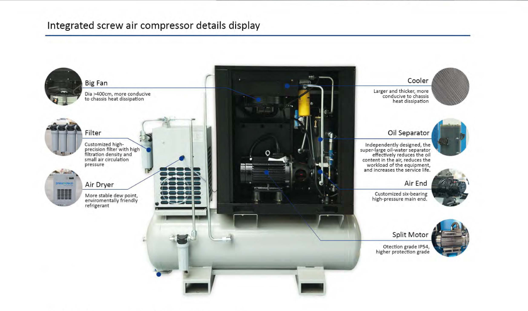 Set screw air compressor, freezer dryer, precision filter, gas storage tank, as one of the design, reduce the site of pipeline installation and floor area, ready to use easy.