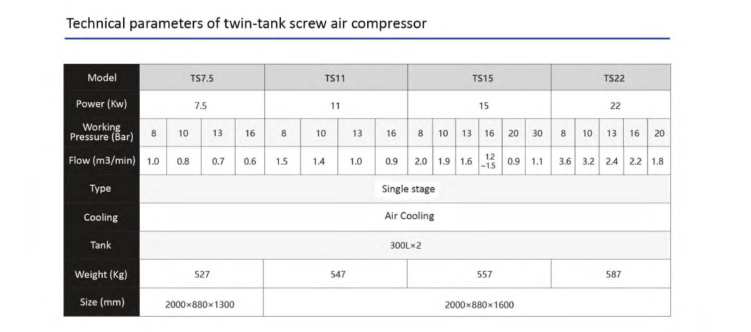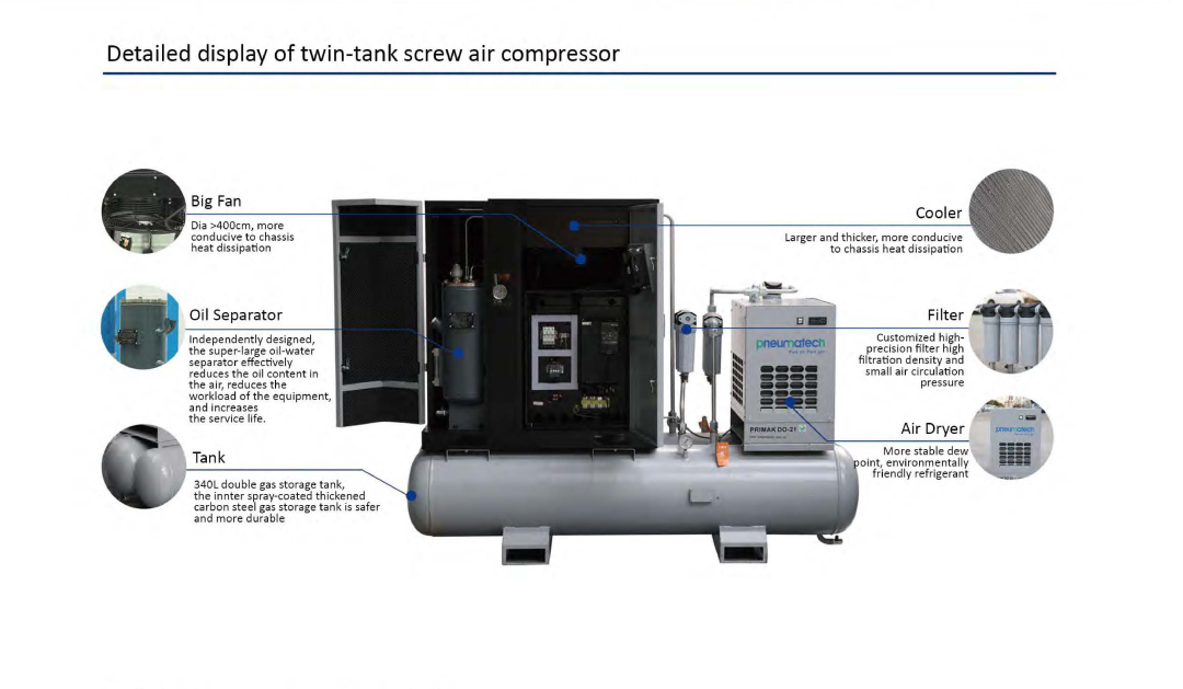 It integrates a screw air compressor, a refrigeration dryer, a precision filter, and dual gas storage tanks into an integrated design, which reduces on-site pipeline installation and floor space. Accumulated, ready to install and use.
