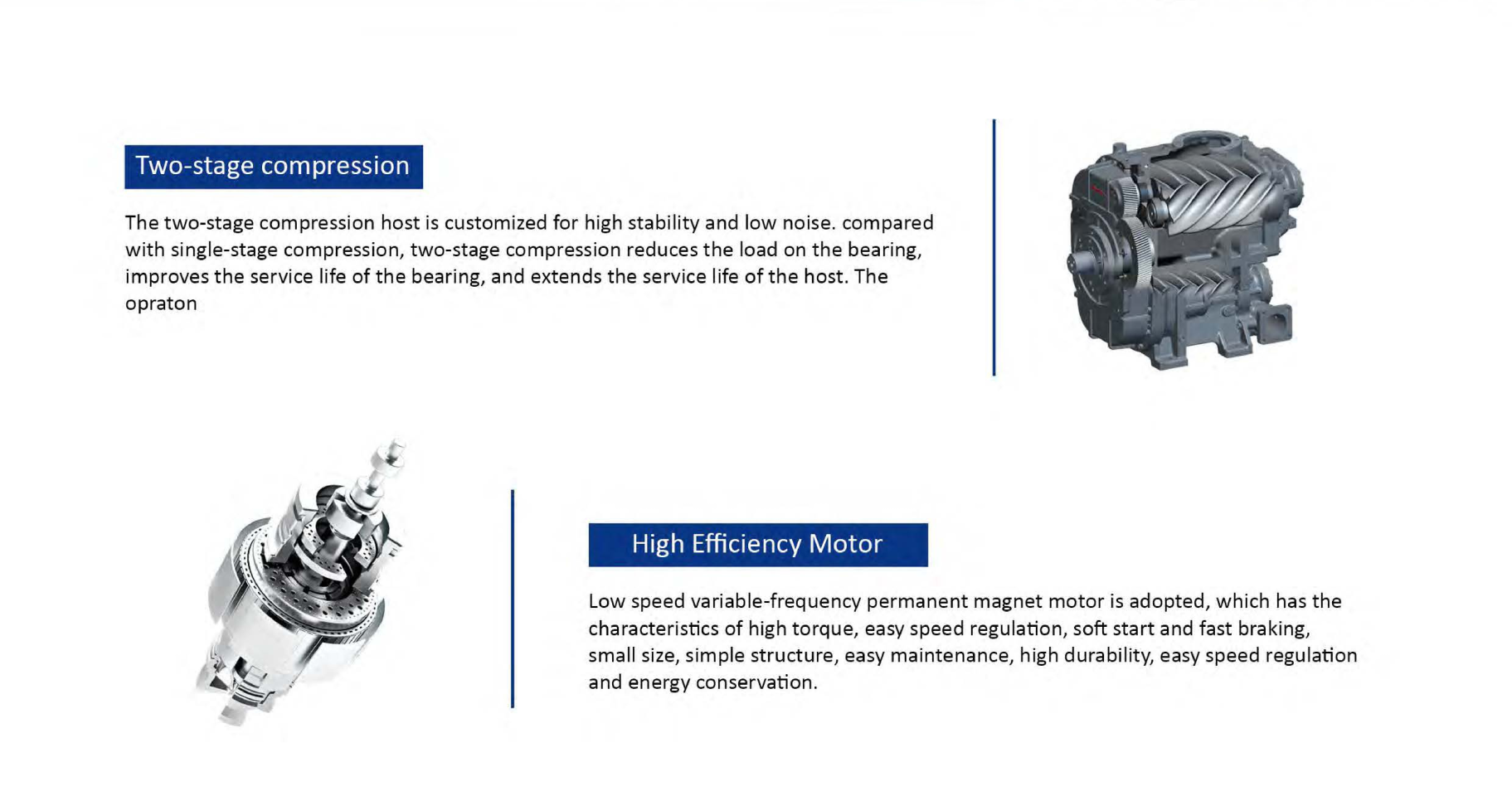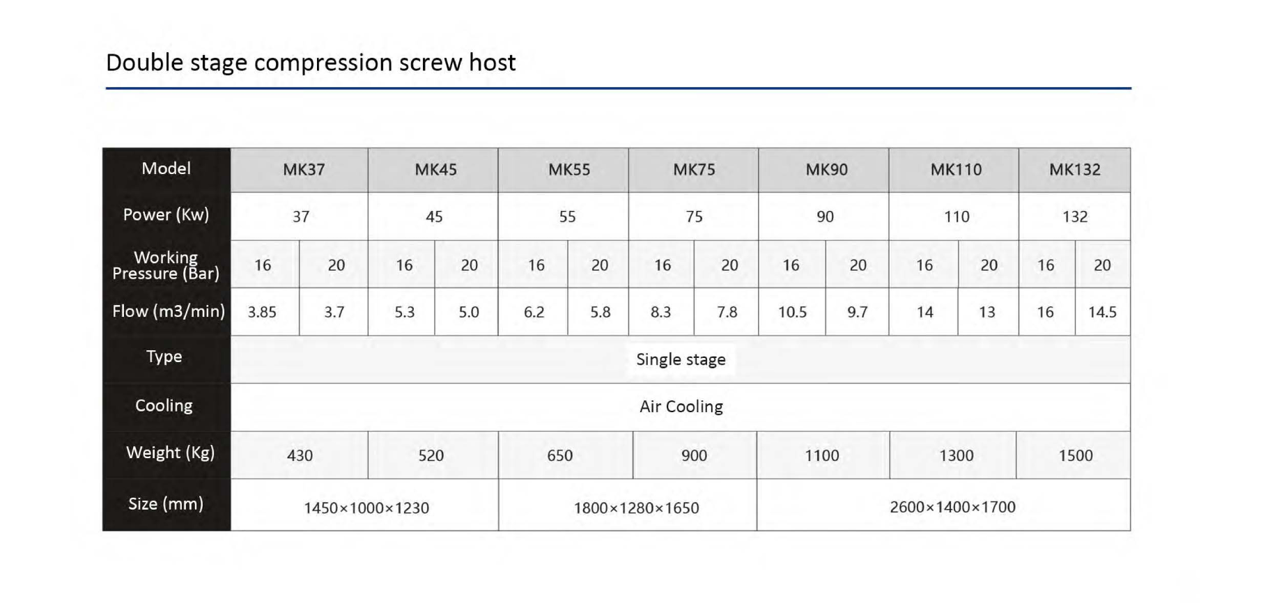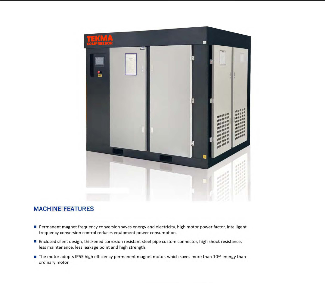 Bipolar compression screw air compressor has strong power, sufficient exhaust volume, constant pressure, strong fuselage, higher compression efficiency, more energy saving.